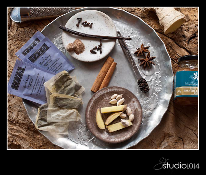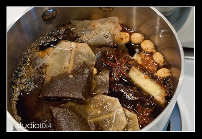 - Add tea bags, all spices, vanilla bean, and zest