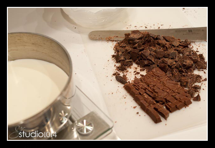 - Chop both chocolates and place in shallow bowl